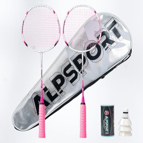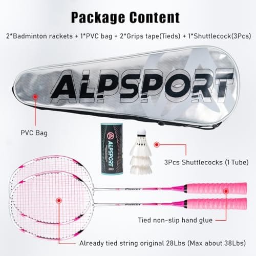 Product Name: ALPSPORT POWER Original Design 4U G5 Graphite Badminton Rackets Sets of 2, Carbon Fiber Racquets with 1 PVC Bag, 2 Tied Grips Tapes, 3 Shuttlecocks, 22-28LBS Padel Raket Professional Installed String Racquet for Outdoor Backyard Indoor Sports Training/ Racket Weight: 4U / 80-85g (Unstrung weight, not includes the grip and string) / Frame: Elastic carbon fiber / Shaft: High rigid carbon fiber / Support tension: 22-28LBS / Pre-Stringing tension: 24LBS / Balance: 295+-5mm / Length: 680mm / Handle: G5