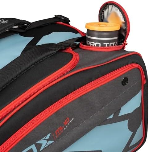 Tiene una capacidad de 80 litros y unas medidas de 60 x 30 x 45 cm. Cuenta con un asa principal ergonómica y una base rígida que brindan comodidad, seguridad y protección para tu equipamiento en el camino a la pista. Es posible quitar las asas, lo que permite mayor versalidad y adaptación a cada situación. Funcionalidad óptima En cuanto a su capacidad de almacenamiento, destaca el compartimento principal con una apertura lateral con capacidad para cuatro palas , ropa y otros accesorios. Además, incorpora un compartimento térmico pensado para tres palas, botellas y otros elementos vulnerables a los cambios de temperatura. El compartimento circular térmico está pensado para bote de 4 pelotas o una botella.